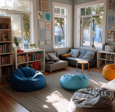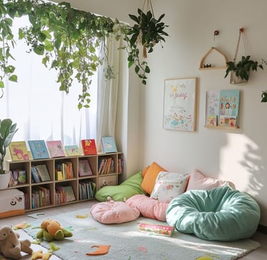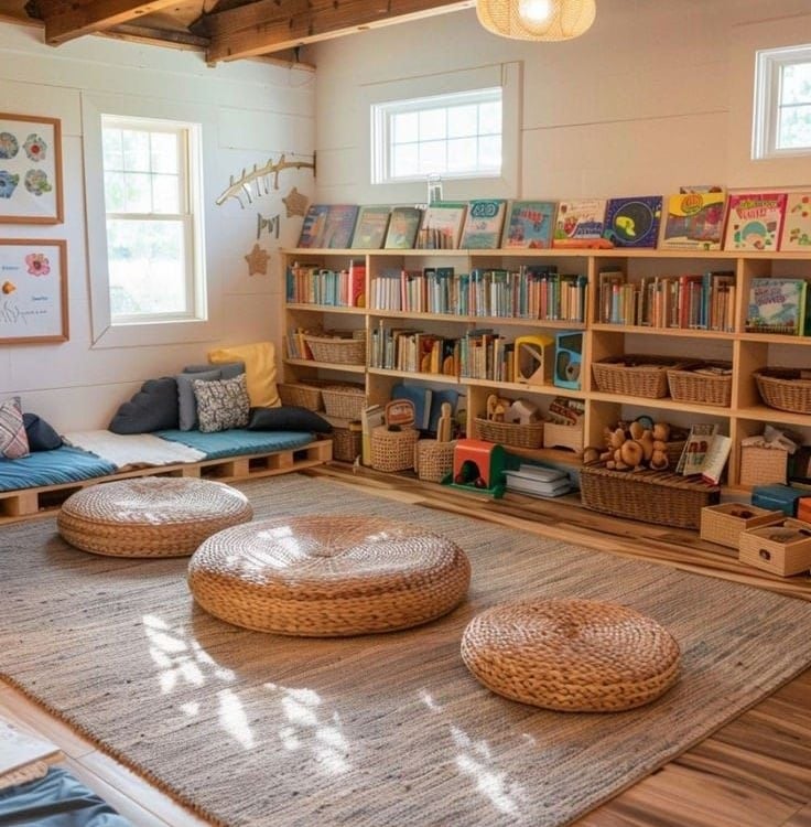 A cozy reading nook creates a safe, calm space where children can slow down and connect with books. Soft seating, warm lighting, and easily accessible books encourage independent reading and help children associate reading with comfort and enjoyment. This area is especially helpful for quiet reading time, emotional regulation, and developing early literacy skills.